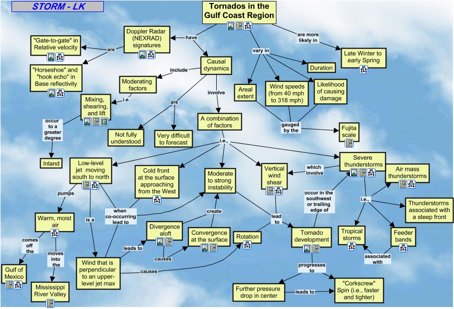 This Concept Map, created with IHMC CmapTools, has information related to: Tornados, Feeder bands associated with Tropical storms, Tornado development progresses to "Corkscrew" Spin (i.e., faster and tighter), A combination of factors i.e., Moderate to strong instability, Severe thunderstorms which involve Vertical wind shear, Mixing, shearing, and lift occur to a greater degree Inland, Vertical wind shear lead to Tornado development, Divergence aloft causes Convergence at the surface, Low-level jet moving south to north is a Wind that is perpendicular to an upper- level jet max, Causal dynamics include Moderating factors, Severe thunderstorms i.e., Tropical storms, Tornados in the Gulf Coast Region have Doppler Radar (NEXRAD) signatures, Severe thunderstorms i.e., Air mass thunderstorms, Convergence at the surface create Moderate to strong instability, Doppler Radar (NEXRAD) signatures are "Horseshoe" and "hook echo" in Base reflectivity, Low-level jet moving south to north pumps Warm, moist air, Divergence aloft create Moderate to strong instability, Rotation lead to Tornado development, Doppler Radar (NEXRAD) signatures are "Gate-to-gate" in Relative velocity, Causal dynamics are Very difficult to forecast, Tornados in the Gulf Coast Region are more likely in Late Winter to early Spring